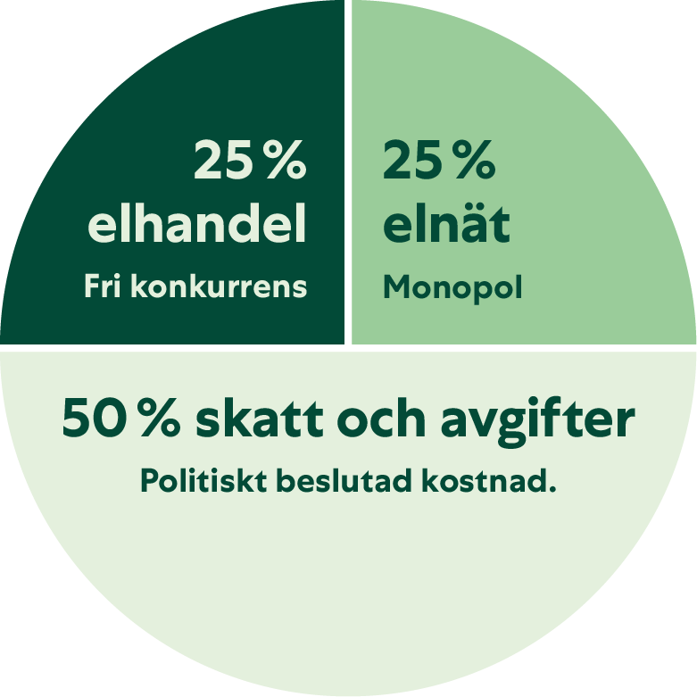 Den största delen av elkostnaden består av olika skatter och avgifter, som beslutas av våra folkvalda politiker. All elanvändning i Sverige är skattepliktig och förutom själva energiskatten består skattekostnaden av moms, pris för elcertifikat och myndighetsavgifter. En vanlig uppskattning är att detta utgör ungefär 50% av hela din elkostnad.