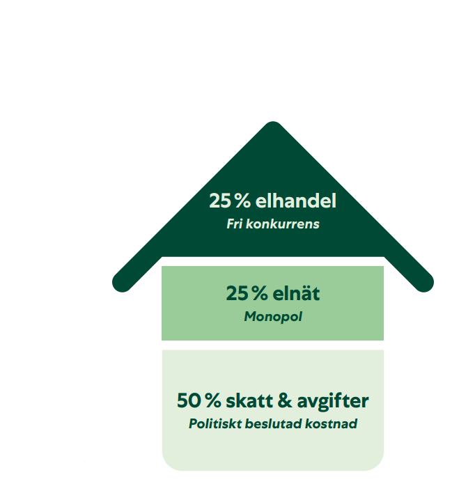 Den största delen av elkostnaden består av olika skatter och avgifter, som beslutas av våra folkvalda politiker. All elanvändning i Sverige är skattepliktig och förutom själva energiskatten består skattekostnaden av moms, pris för elcertifikat och myndighetsavgifter. En vanlig uppskattning är att detta utgör ungefär 50% av hela din elkostnad.