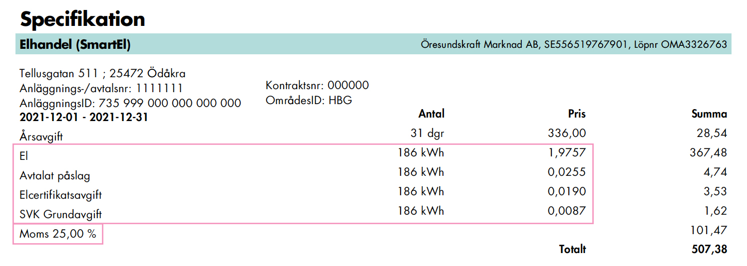 Jajamän! Det ser du på sida 2 i din faktura, i det rosamarkerade området på bilden nedan. Om du har ett rörligt elavtal (SmartEl) krävs det lite matematik, så ta fram miniräknaren: