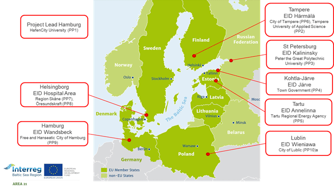 Projektets tio partners kommer från länderna runt Östersjön och har alla valt ut energiförbättringsområden (Energy Improvement Districts, EID), varav flera är bostadsområden med stor potential. Öresundskraft har gått samman med Region Skåne om att arbeta mot ett energismartare sjukhusområde i Helsingborg, som just nu byggs om och till.