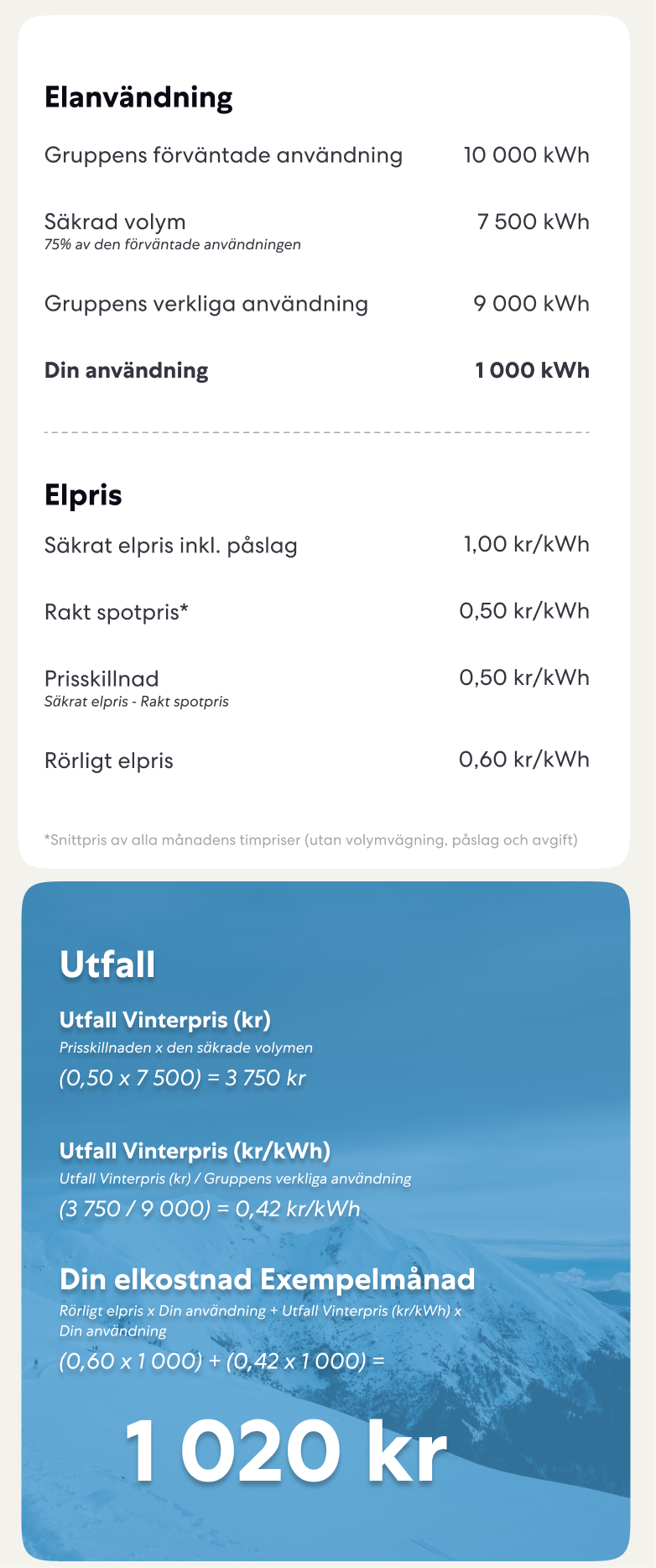 Vi säkrar elpriset åt alla som tecknar Vinterpris i en stor grupp - hur mycket du betalar varje månad påverkas dels av vad det rörliga elpriset blir men också av hur mycket el gruppen använder. Utfallet redovisas noga i en fakturabilaga varje månad och på den här sidan kan du ta del av olika exempel.